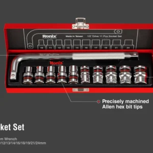 جعبه بکس 11 پارچه رونیکس RH-2610 — مجموعهای حرفهای از سوکتهای 1/2″ کروم-وانادیوم با روکش کروم آینهای، شامل سوکتهای سایزهای پراستفاده و کیف فلزی مستحکم؛ مناسب تعمیرگاهها، کارگاهها و کاربران حرفهای برای اعمال گشتاور بالا و دوام طولانی.